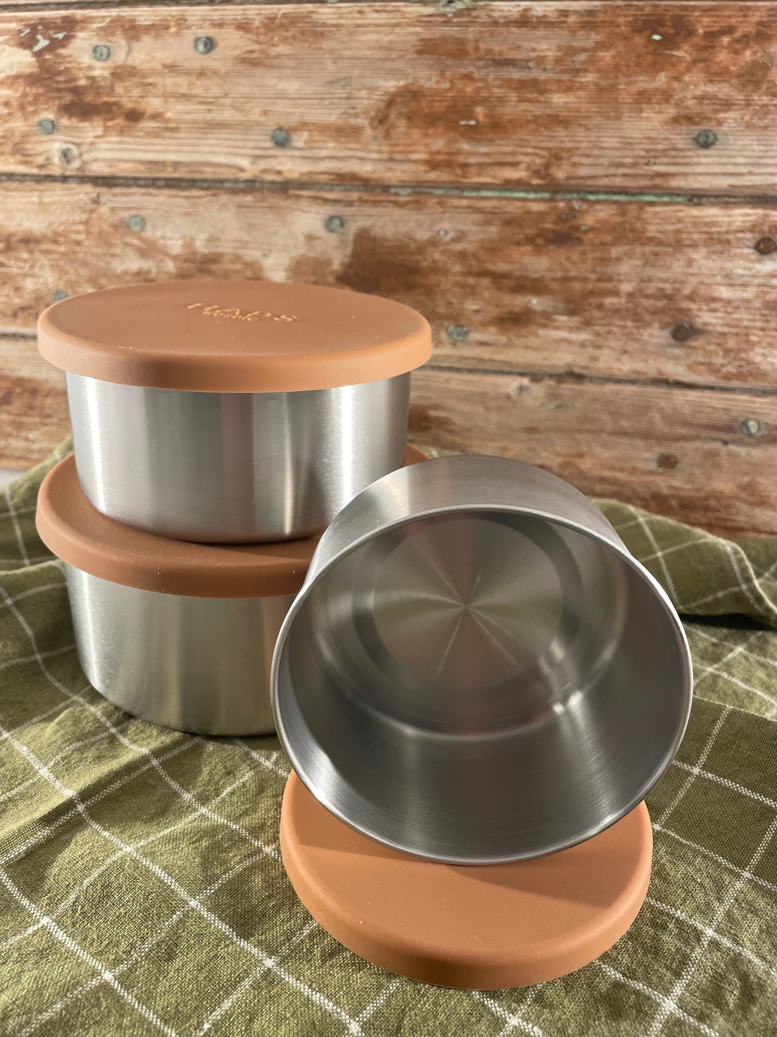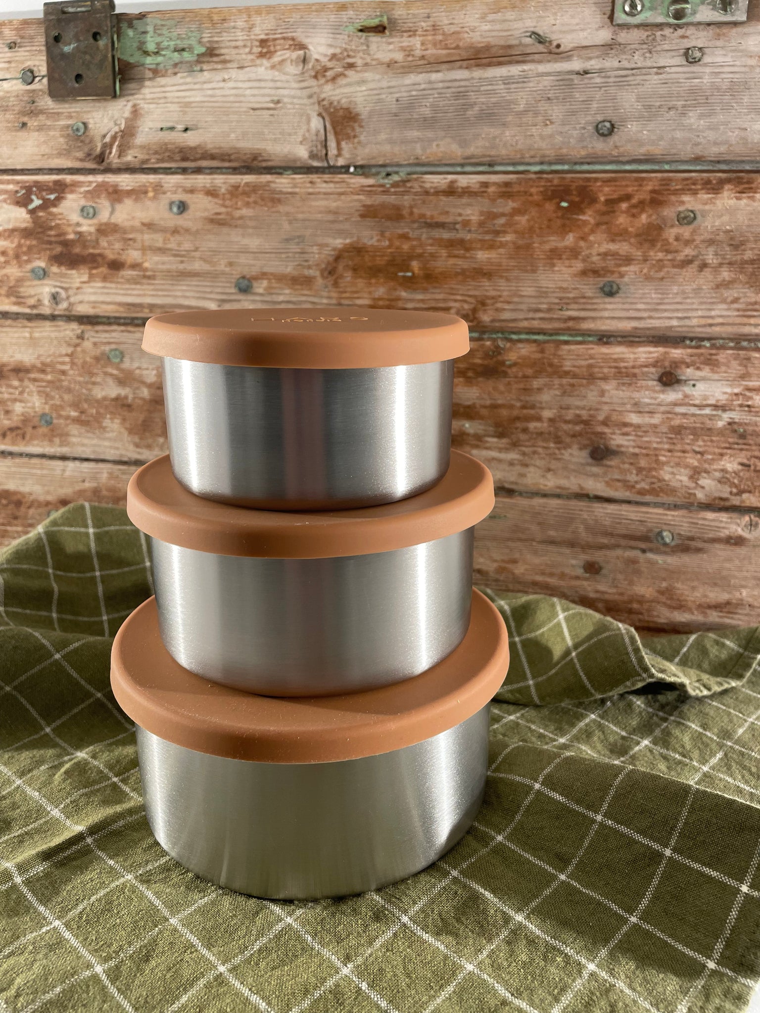 3 stk lette og holdbare bokser for oppbevaring av matvarer. Boksene er laget av matvaregodkjent rustfritt 18/8 stål, og med silikonlokk.